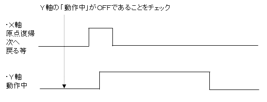 動作中かエラーでないことをチェック、動作中であれば待つ 2)1ビット目をONしY軸へ「原点復帰」命令 3)X軸原点復帰 4)Y軸