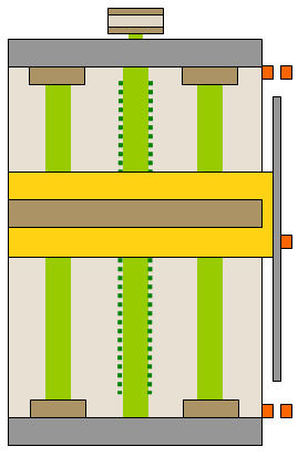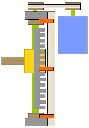 ・レバーシブルモーターでボールネジを回転させ、マガジンを乗せる台を上下させます。 ・ボールネジの両側にはシャフトを設置し、リニアブッシュで平行を保ちます。 ・上下させるピッチはスリットが入った板をフォトカプラで検出させます。 ・上限リミット、下限リミット用のフォトカプラも付けています。